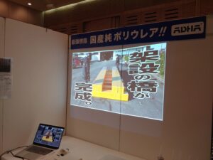 防衛省をはじめとする多くの方々が出展ブースに足を止められ、動画などを通じて「たまぼう」とポリウレアについて情報共有ができました。